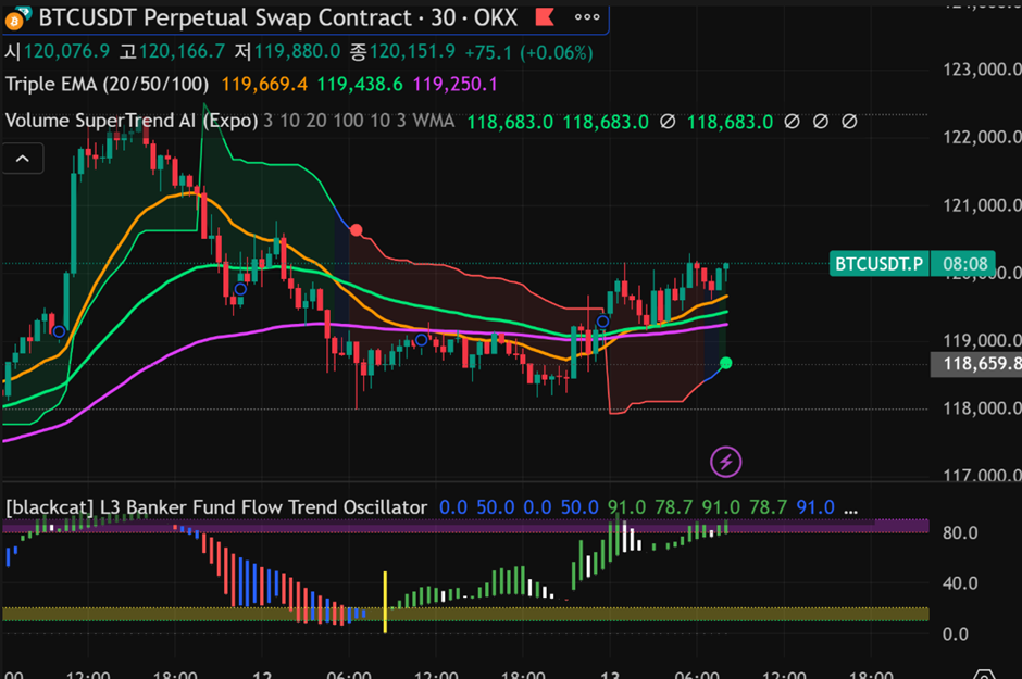 - ✅ EMA 정렬 + SuperTrend 색 + Banker 방향이 같은 쪽만 거래.
