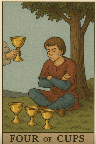 Four of Cups는 타로의 컵 슈트에서, 내면 감정의 흐름이 일시적으로 정체되는 순간을 담고 있다. 이 카드는 대개 한 인물이 나무 아래 앉아 세 개의 컵을 바라보거나 외면하고 있으며, 하늘에서는 또 다른 컵 하나가 그에게 제시되고 있는 장면으로 묘사된다. 그가 고개를 돌리고 있는 이유는 사람마다 다를 수 있다. 누군가는 실망 때문이고, 또 누군가는 감정의 소용돌이 속에서 잠시 휴식을 선택했기 때문이다.